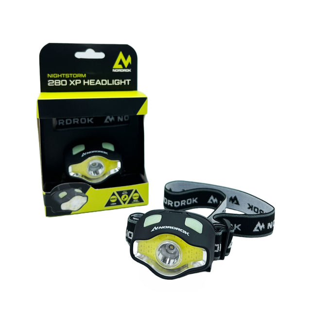 The Nordrok Nightstorm 280 Headlight is a compact light that incorporates a 3 watt multi-colour COB flood beam LED, along with a 3 watt high power LED for focused beam distance. The combined lumen output is 280 lumens. The 3 watt multi-colour COB LED has white, green and red night vision colour mode. The 3 watt high power LED features energy-saving modes of 100%/50% & Flashing. The two LED light modes are accessible via the glow-in-the-dark buttons on the lighthead unit. The elasticated two-way headband and light unit angle are both adjustable. The rubberised finish housing and battery compartment are designed and made to be IP54 weatherproof. The light unit requires 3 x AAA batteries (not supplied)